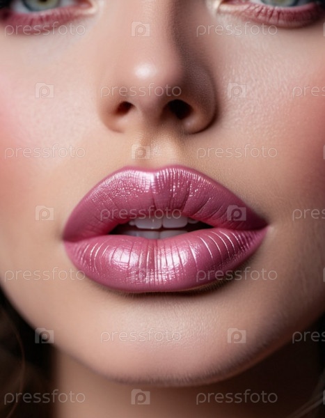 Крупный план женских губ с мерцающей розовой помадой, которая добавляет немного блеска. Губы слегка приоткрыты, открывая вид на белые зубы. Чувственность и сексуальность. Создано с помощью ИИ