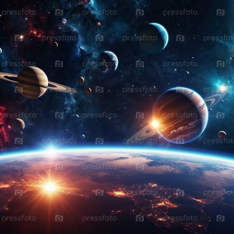 Планетарная система с несколькими планетами, большим ярко окрашенным газовым гигантом и каменистой планетой. Яркие звезды и огромное пространство темного космоса с галактикой на заднем плане. Космические просторы. Космонавтика. ИИ
