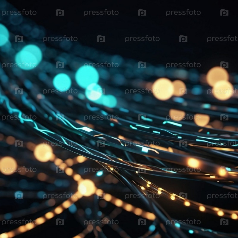 Синие и оранжевые светящиеся провода скручиваются и переплетаются на темном фоне с боке-огнями. Черные кабели и разъемы со светящимися огнями и цепями соединяются, образуя сеть. Создано с помощью ИИ