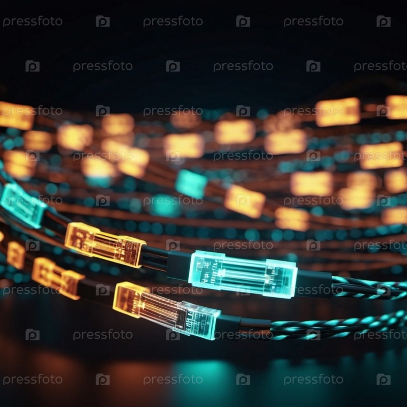 Синие и оранжевые светящиеся провода скручиваются и переплетаются на темном фоне с боке-огнями. Черные кабели и разъемы со светящимися огнями и цепями соединяются, образуя сеть. Создано с помощью ИИ
