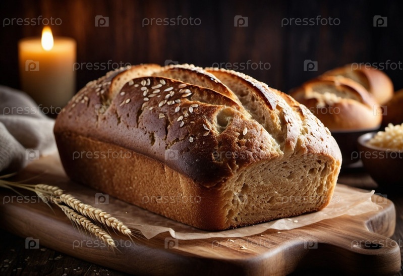 Свежевыпеченный ржаной хлеб лежит на деревянной доске, демонстрируя свою золотисто-коричневую хрупкую корочку, украшенную семьями кунжута.Теплый хлеб прямоугольной формы излучает соблазнительный аромат, который заполняет уютную кухню