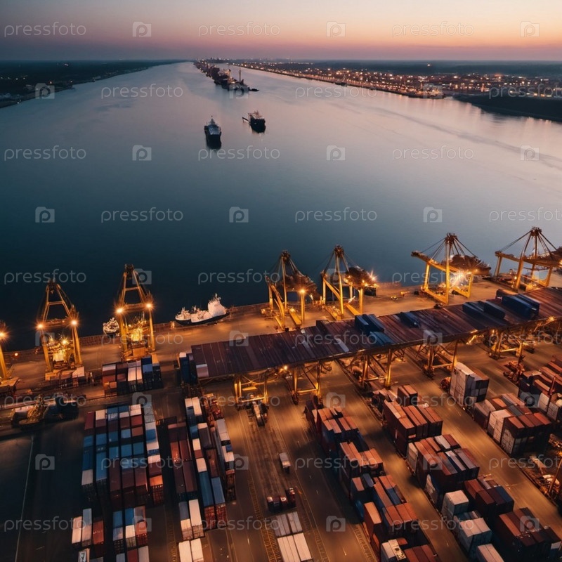 Вид с воздуха на рассвете показывает оживленный торговый порт с аккуратно сложенными контейнерами и кранами, готовыми к работе. Спокойные воды отражают мягкий утренний свет. Промышленная деятельность. Генеративный ИИ