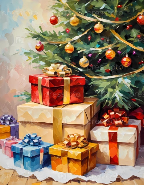 Декорированная рождественская елка, украшенная красочными игрушками и сложенными подарками, готова к празднованию в уютной праздничной обстановке. упакованные подарки разных цветов. Праздничная атмосфера, теплота и радость. AI