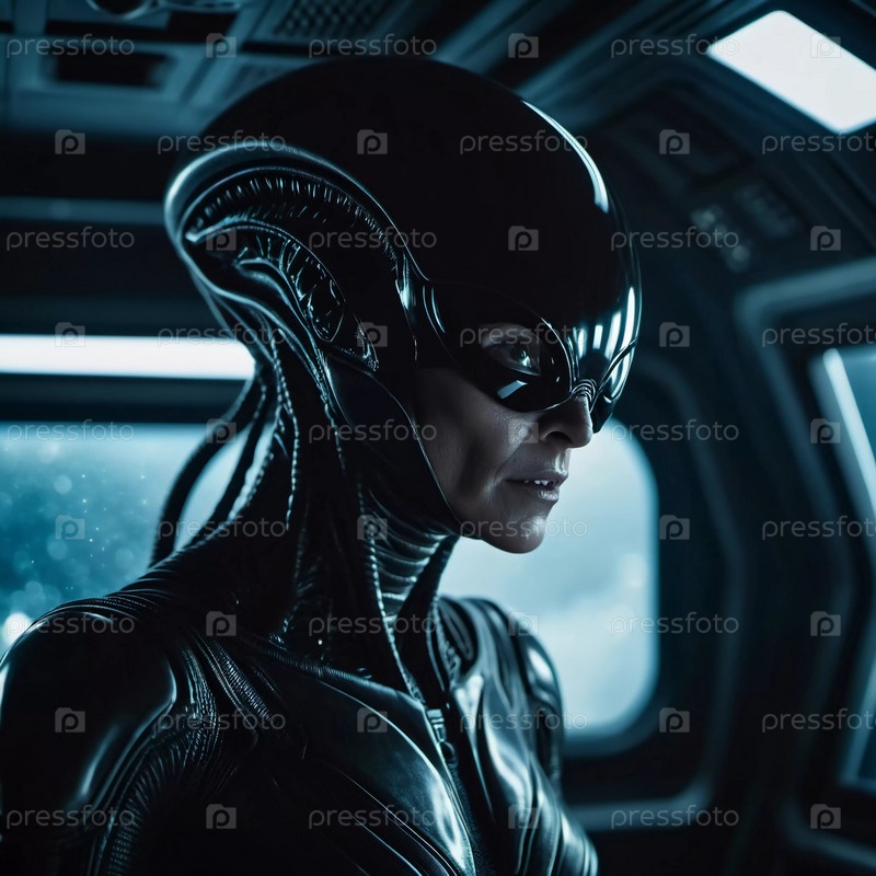 Встреча с инопланетянами на борту космического корабля, исследующего пустоту, с акцентом на члене экипажа, выражающем глубокую концентрацию во время навигации в космосе. Генеративный ИИ