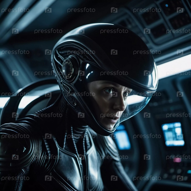 Встреча с инопланетянами на борту космического корабля, исследующего пустоту, с акцентом на члене экипажа, выражающем глубокую концентрацию во время навигации в космосе. Генеративный ИИ