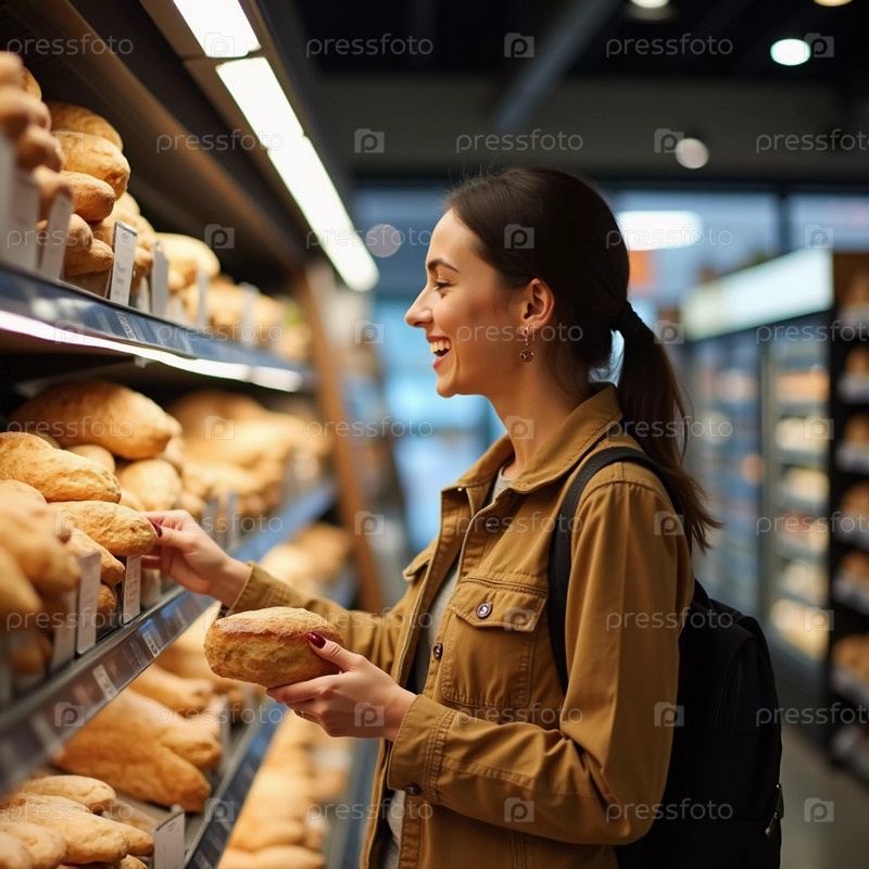 Женщина стоит в пекарне, тщательно выбирая буханку хлеба из хорошо укомплектованной витрины. Пекарня предлагает широкий выбор свежей выпечки, создавая теплую атмосферу. Генеративный ИИ