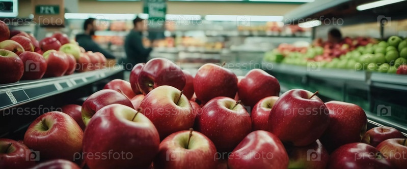 Разноцветный ассортимент красных яблок аккуратно разложен на прилавке супермаркета, приглашая покупателей рассмотреть и выбрать свежие фрукты. Генеративный ИИ