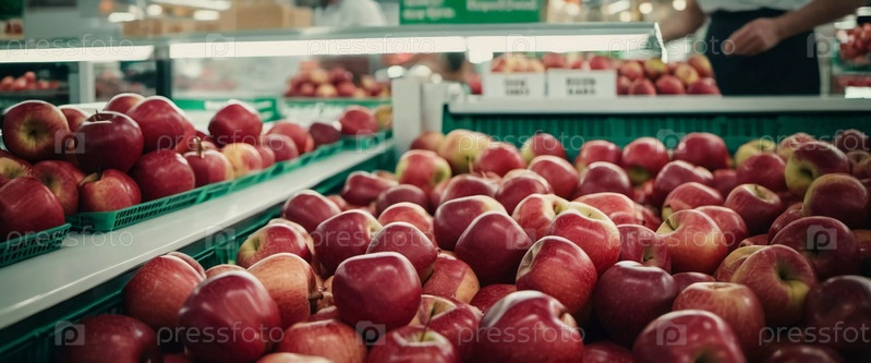 Разноцветный ассортимент красных яблок аккуратно разложен на прилавке супермаркета, приглашая покупателей рассмотреть и выбрать свежие фрукты. Генеративный ИИ