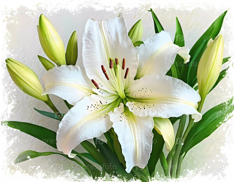 Потрясающая композиция из белых лилий с яркими зелеными стеблями и бутонами, подчеркивающая их нежные лепестки и яркий внешний вид в мягкой, привлекательной обстановке. Генеративный ИИ