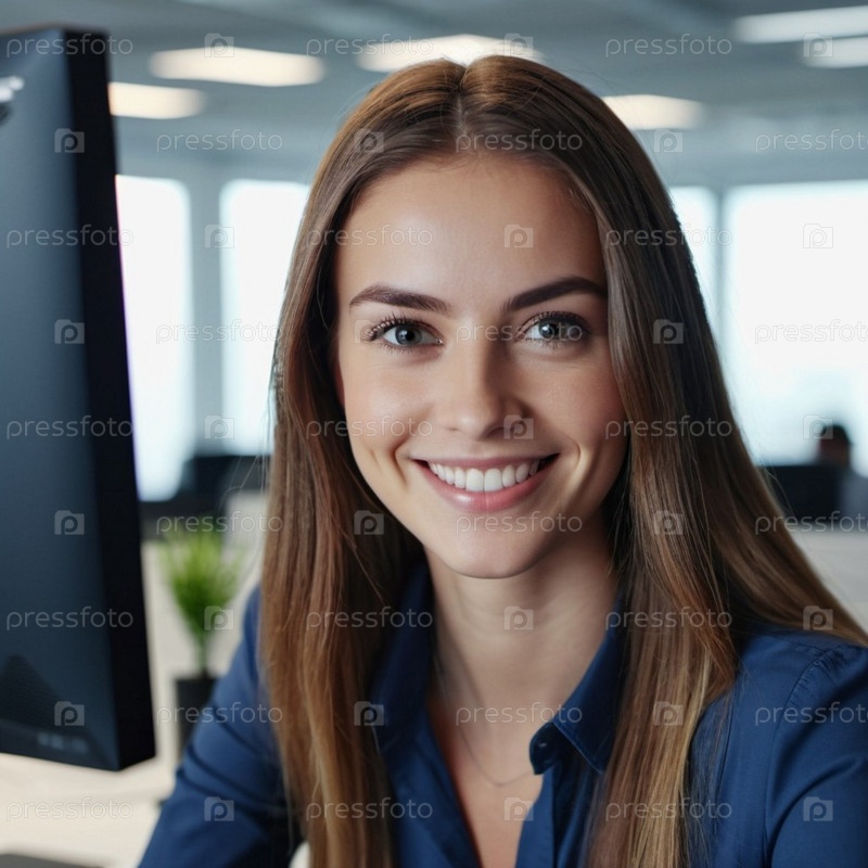 Профессиональная белая женщина в синей рубашке сидит за своим столом в современном офисе, излучая уверенность и позитив. Окружающая среда усиливает ее доступное поведение. Генеративный ИИ