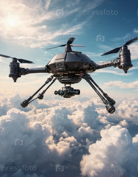 Усовершенствованный боевой дрон парит над пушистыми облаками, готовясь к развертыванию своего груза в ходе военной операции, демонстрируя воздушные возможности. Генеративный ИИ