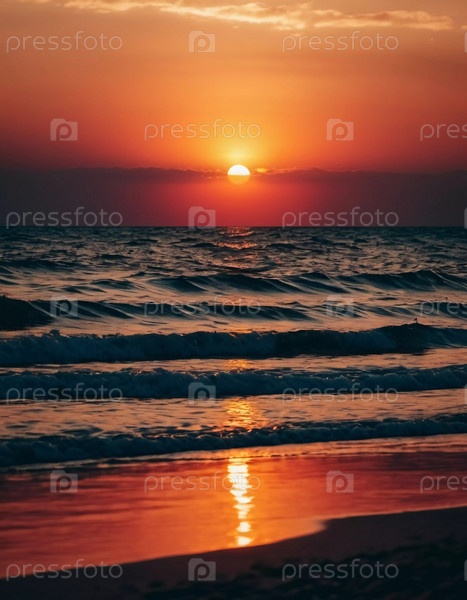 Теплое сияние заходящего солнца бросает золотые оттенки на спокойные волны океана, создавая тихую атмосферу на берегу в сумерках. Закат или восход солнца на море. Романтический пейзаж. AI