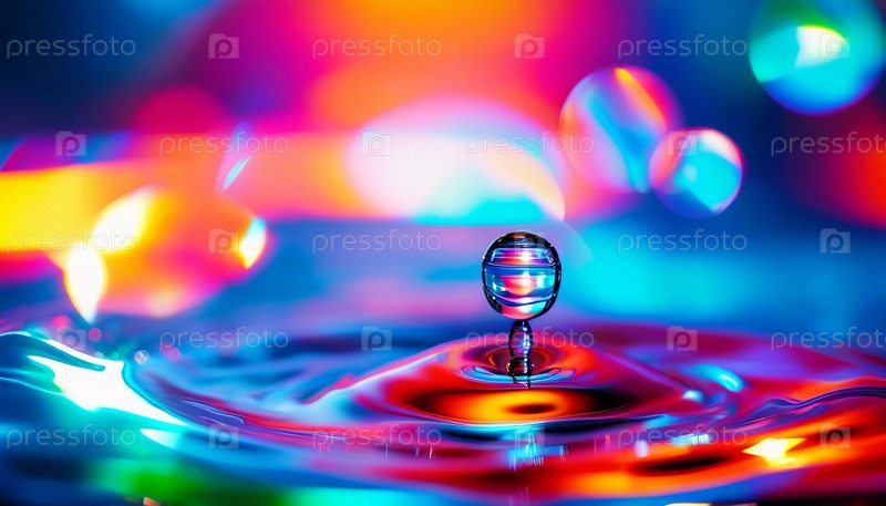 Множество ярких капель взрываются красочным всплеском, создавая потрясающую демонстрацию ярких оттенков на мягко размытом фоне. Застывшее движение. Красота природы в данный момент. ИИ