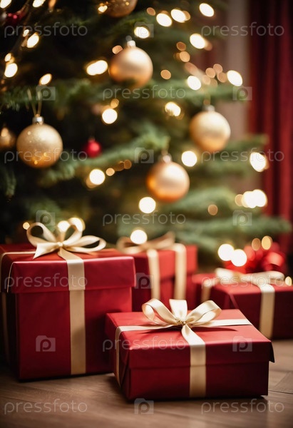 Уютная гостиная, украшенная праздничной рождественской елкой, украшенной сверкающими огнями и красочными безделушками, окруженная множеством тщательно упакованных подарочных коробок, ожидающих открытия. Искусство ИИ