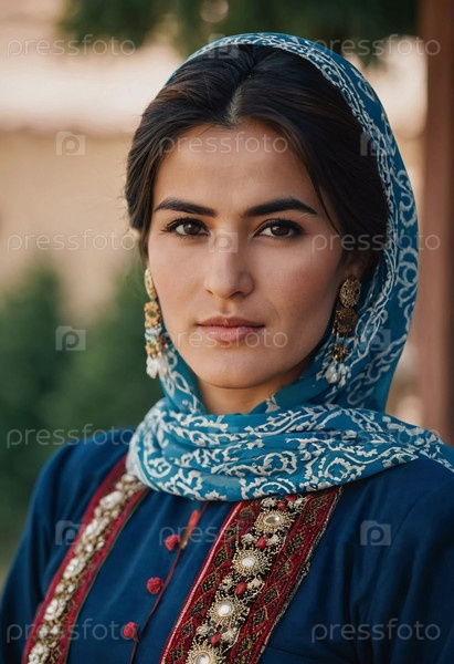Таджикская женщина 30 лет грациозно стоит, демонстрируя свой традиционный наряд на захватывающем фоне гор и сочных зеленых полей, отражающих ее культурные корни. Сгенерировано с помощью ИИ