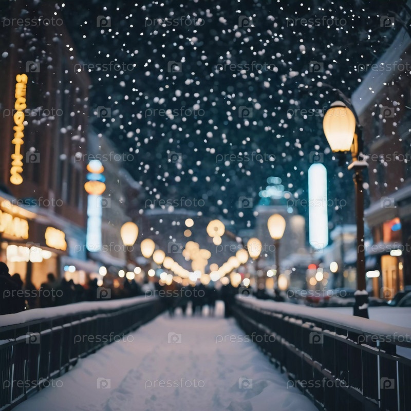 Тихий зимний вечер окутывает городскую улицу, где мягко падающий снег усиливает свечение рождественских огней. Праздничная атмосфера привлекает людей, празднующих Новый год. Генеративный ИИ