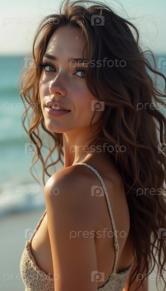 Брюнетка в купальнике оглядывается назад, стоя у береговой линии. Нежные морские волны пляшут у ее ног под ясно голубым небом. Длинные волосы, красивое молодое лицо. Реклама путешествий и одежды. AI