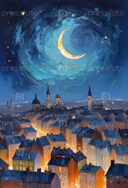 Золотые огни мерцают на крышах домов, полумесяц и разбросанные звезды освещают безмятежное ночное небо над прекрасным городским пейзажем. Генеративный ИИ