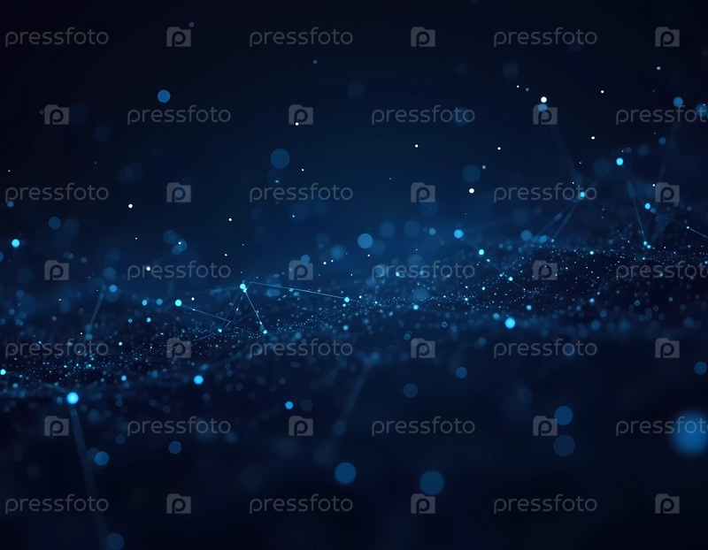 Композиция включает в себя плавные синие линии и светящиеся узлы, которые представляют сложные взаимодействия больших данных в цифровой среде. Футуристический вид подчеркивает технологию и связь. ИИ