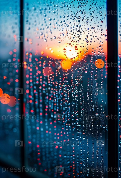 Капли дождя цепляются за оконное стекло, образуя замысловатые узоры, отражая мягкий свет заката. Теплые цвета смешиваются, создавая безмятежную атмосферу во время дождливого вечера. Генеративный ИИ