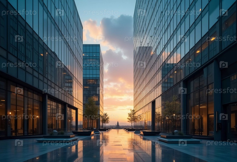 Высокое офисное здание с большими стеклянными окнами отражает яркие цвета заката.Городская обстановка и чистое небо создают спокойную атмосферу, когда день переходит в ночь