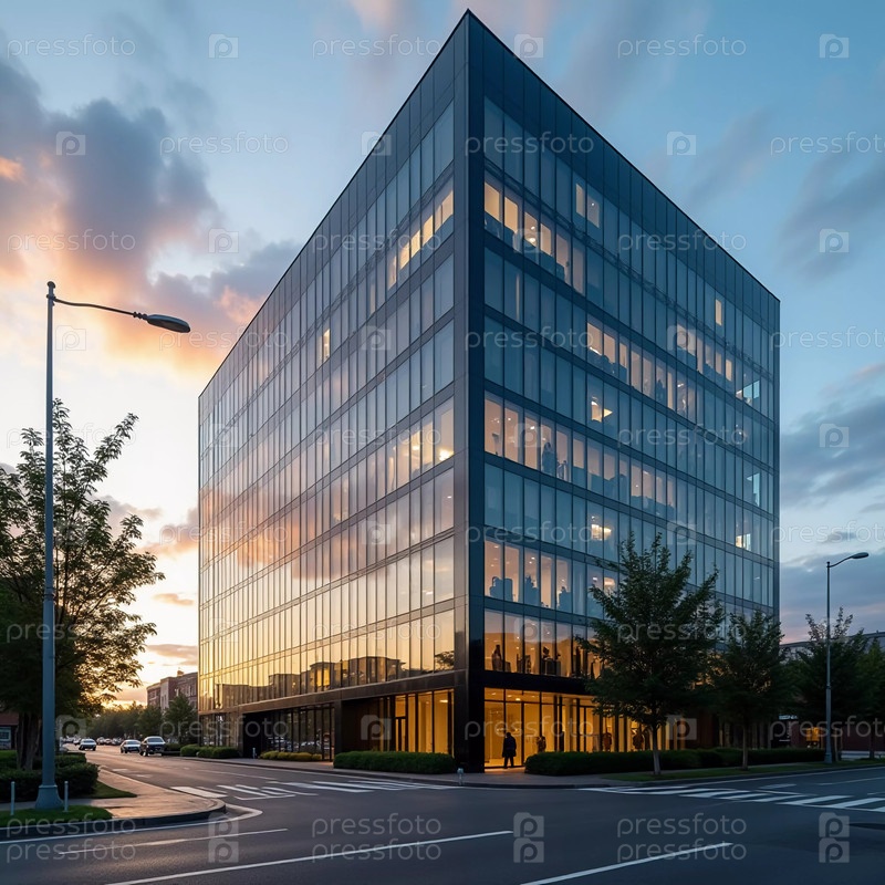 Высокое офисное здание с большими стеклянными окнами отражает яркие цвета заката.Городская обстановка и чистое небо создают спокойную атмосферу, когда день переходит в ночь