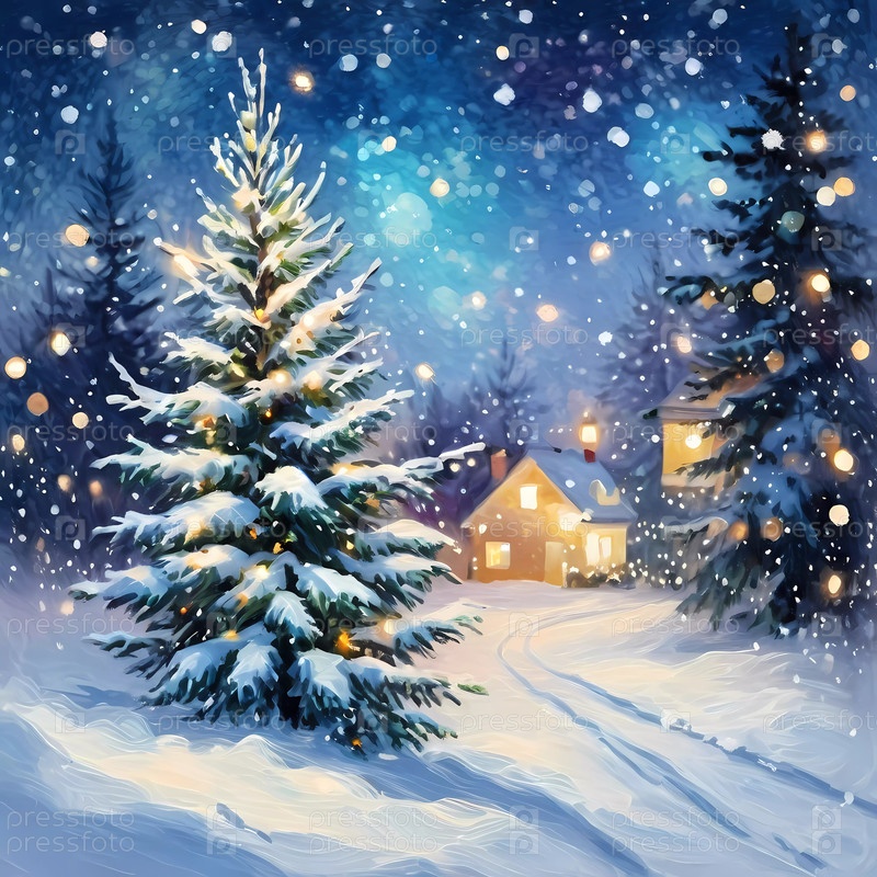 В тихую снежную ночь мягкие рождественские огни боке украшают еловые ветки на фоне живописного пейзажа. Видны уютные дома, излучающие тепло и праздник в зимней сказке. Генеративный ИИ
