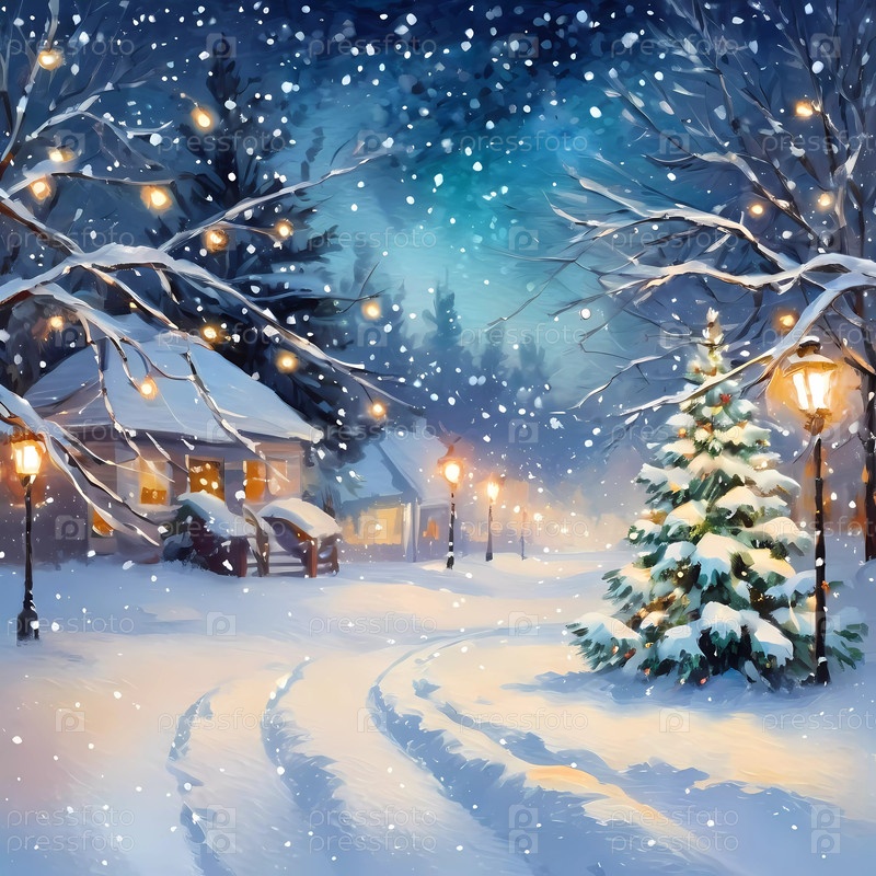 В тихую снежную ночь мягкие рождественские огни боке украшают еловые ветки на фоне живописного пейзажа. Видны уютные дома, излучающие тепло и праздник в зимней сказке. Генеративный ИИ