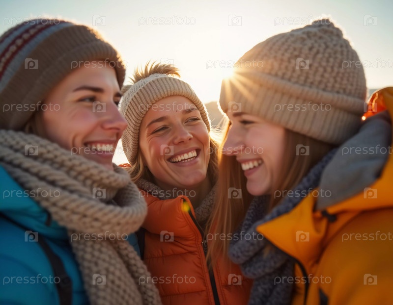 Молодые друзья собираются в зимней стране чудес, разделяя радостные моменты и смех под ярким солнцем. Они щеголяют в уютной зимней одежде, подчеркивая свое веселое приключение. Генеративный ИИ