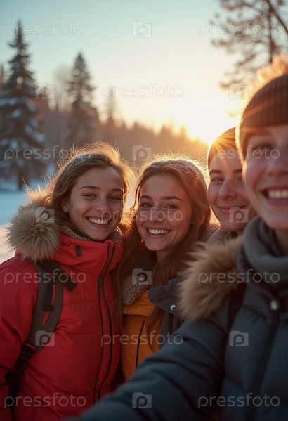 Молодые друзья собираются в зимней стране чудес, разделяя радостные моменты и смех под ярким солнцем. Они щеголяют в уютной зимней одежде, подчеркивая свое веселое приключение. Генеративный ИИ
