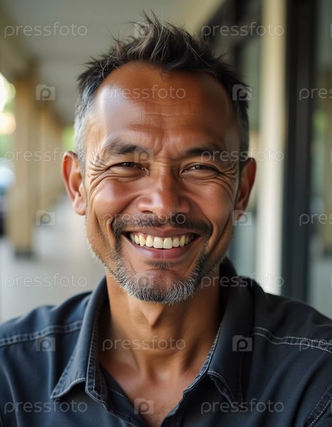 Радостный житель Таиланда тепло улыбается в камеру, демонстрируя свое счастье. Он находится на улице, греется на солнце и наслаждается оживленной атмосферой своего окружения. Генеративный ИИ