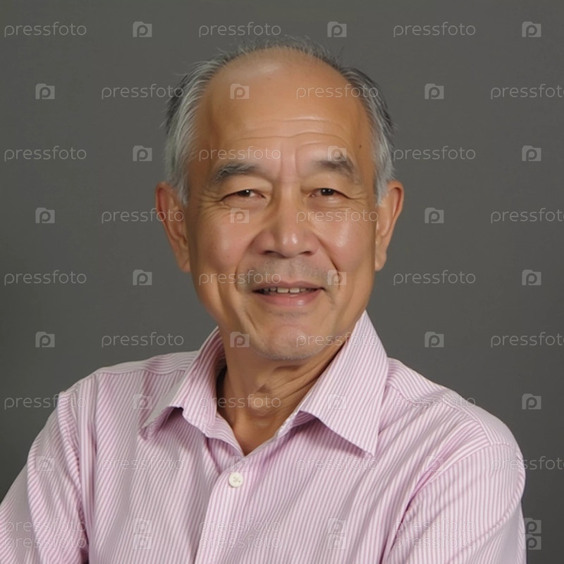 Мужчина-житель Таиланда тепло улыбается на портрете. У него седые волосы, он одет в светло-розовую рубашку. Фон нейтральный, подчеркивающий его выражение и манеру поведения. Генеративный ИИ