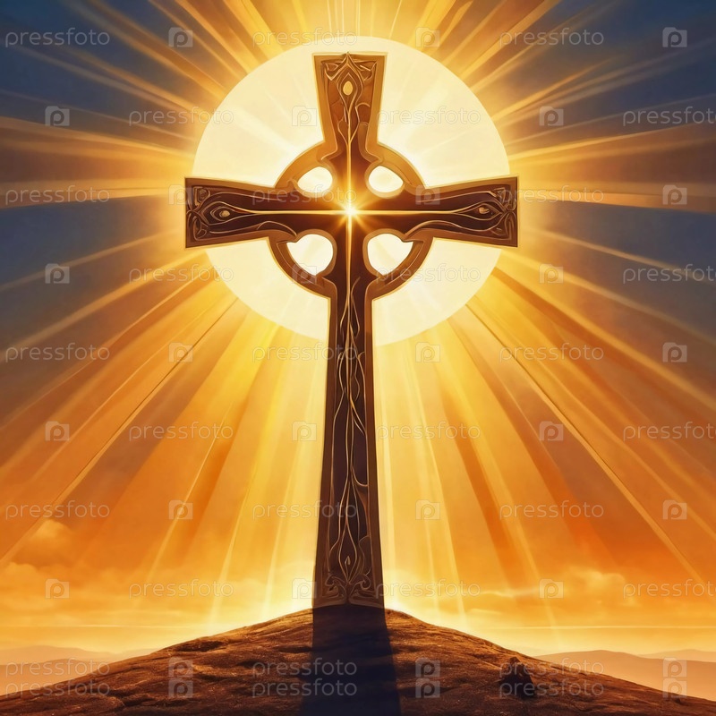 Кельтский крест возвышается на вершине холма, купаясь в ярком солнечном свете на рассвете. Окружающий ландшафт демонстрирует яркие цвета и безмятежность. Генеративный ИИ
