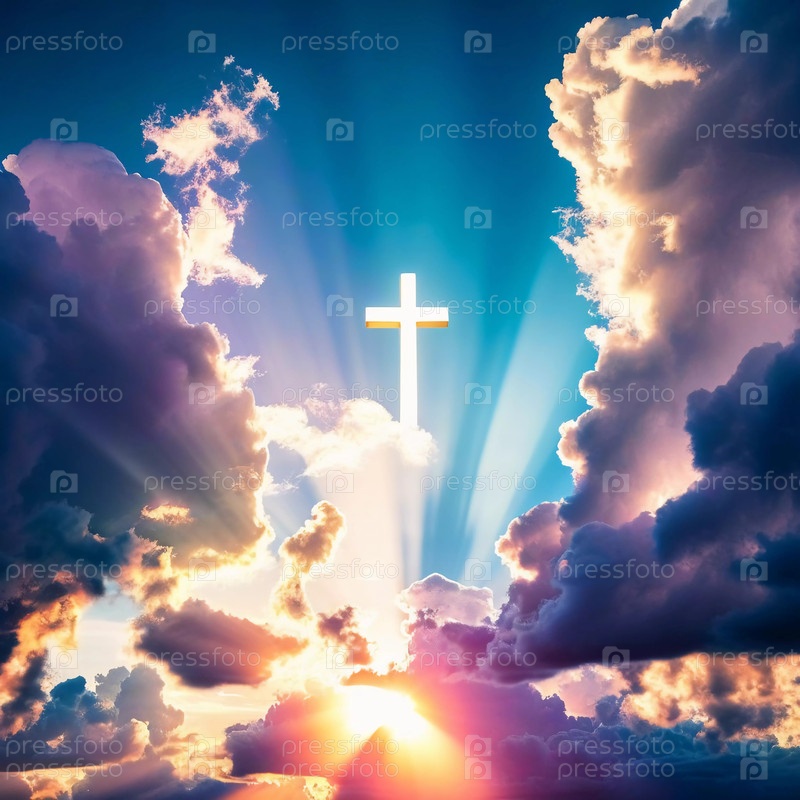 Прекрасный восход солнца прорывается сквозь облака, сияющие лучи света вокруг белого креста. Небо окрашено в цвета рассвета, создавая безмятежную и воодушевляющую атмосферу. Генеративный ИИ