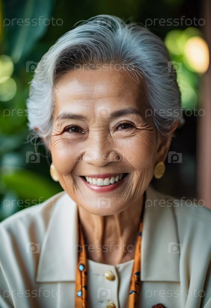 Радостная женщина в свои золотые годы излучает счастье, окруженная пышной зеленью. Ее теплая улыбка и элегантный наряд отражают красоту тайской культуры