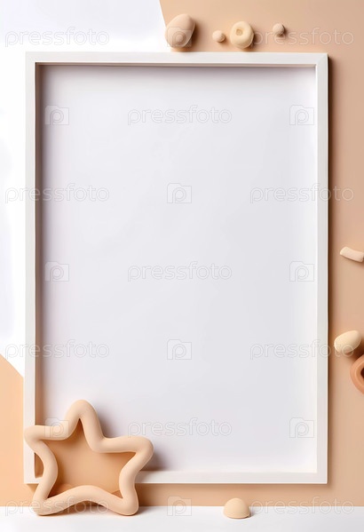 Пустая белая рамка окружена различными игривыми фигурами из пластилина бежевого и кремового оттенков, создавая стильное пространство для творческих проектов или экспозиций