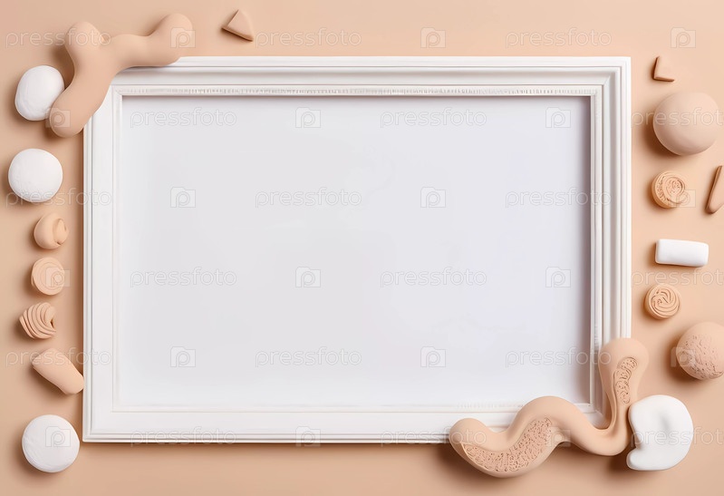 Разнообразные фигурки из пластилина креативно окружают пустую рамку на белом бежевом фоне, поощряя художественное самовыражение и творческую деятельность по созданию поделок