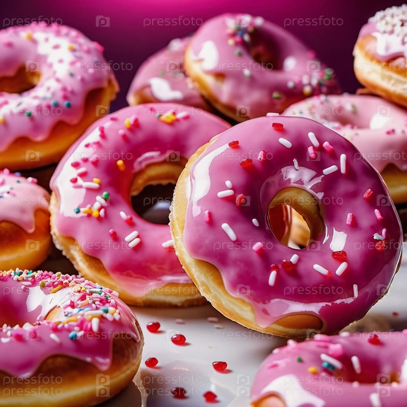 Очаровательные пончики с розовой клубничной глазурью выставлены на деревенском деревянном фоне. Посыпка и украшения из конфет добавляют яркие цвета, создавая праздничное угощение. Генеративный ИИ