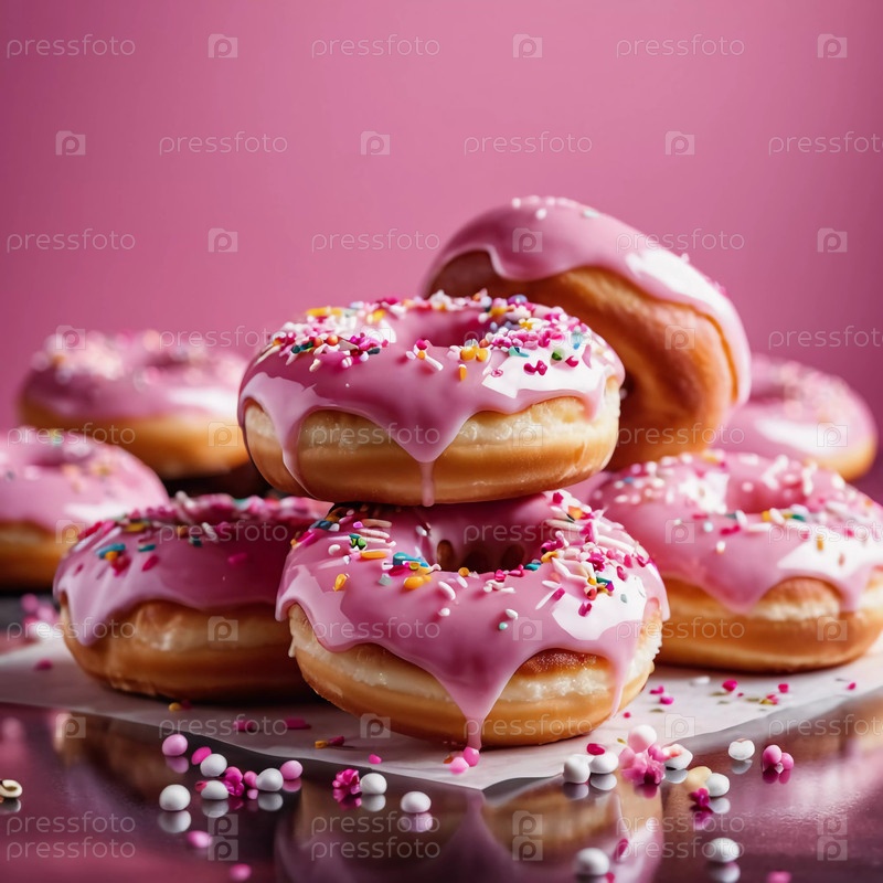 Очаровательные пончики с розовой клубничной глазурью выставлены на деревенском деревянном фоне. Посыпка и украшения из конфет добавляют яркие цвета, создавая праздничное угощение. Генеративный ИИ