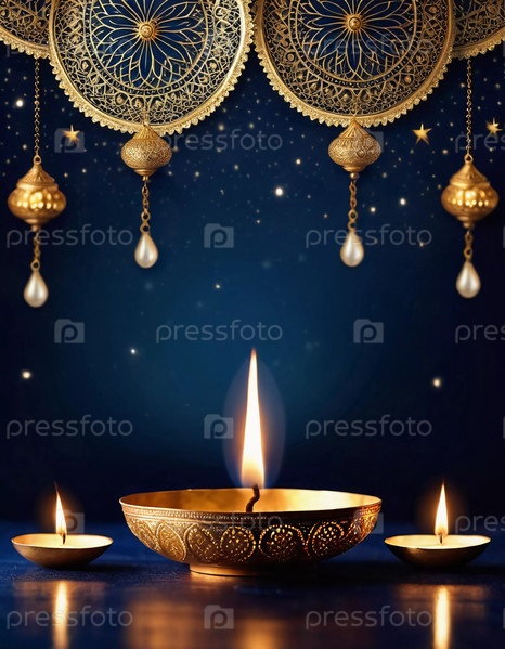 Лампы Diya освещают праздничный витрину, демонстрируя сложные узоры и теплый огонь. Идеально подходит для празднования Дивали или Рамадана с элегантностью и радостью