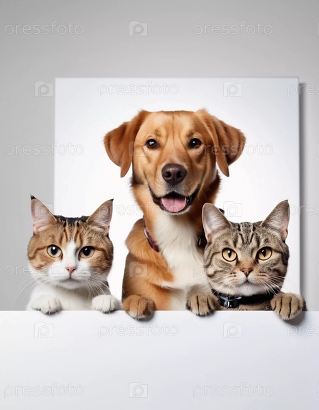 Веселая собака и две любопытные кошки выглядывают из-за белого барьера, демонстрируя дружелюбное поведение в обстановке ветеринарной клиники во время регулярного медицинского осмотра. Товары для животных, приют. Генеративный ИИ