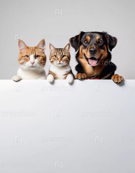 Дружелюбная собака и две игривые кошки позируют вместе, выглядывая из-за пустой поверхности. Они кажутся любопытными и занятыми в обстановке помещения, готовыми к веселой сессии. Ветеринария, продажа товаров для животных. ИИ