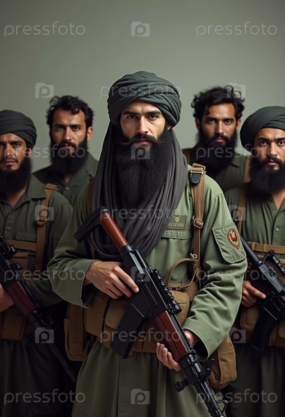 Группа вооруженных мужчин, одетых в традиционную одежду, стоит сплоченно, демонстрируя товарищество и готовность. Воинствующие мусульмане, похожие на Талибан или пакистанскую армию. Густая борода. Генеративный ИИ