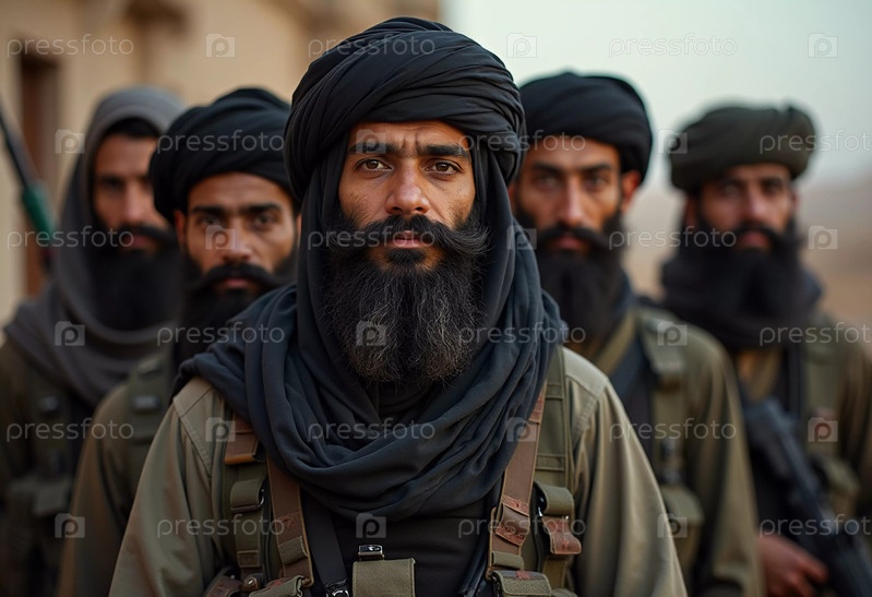 Группа вооруженных мужчин, одетых в традиционную одежду, стоит сплоченно, демонстрируя товарищество и готовность. Воинствующие мусульмане, похожие на Талибан или пакистанскую армию. Густая борода. Генеративный ИИ