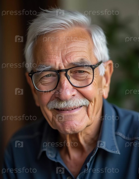 Пожилой мужчина, житель США, с седыми волосами, сияет от радости, демонстрируя свою дружелюбную манеру поведения в повседневной одежде. Теплая внутренняя обстановка усиливает его привлекательную улыбку. Генеративный ИИ