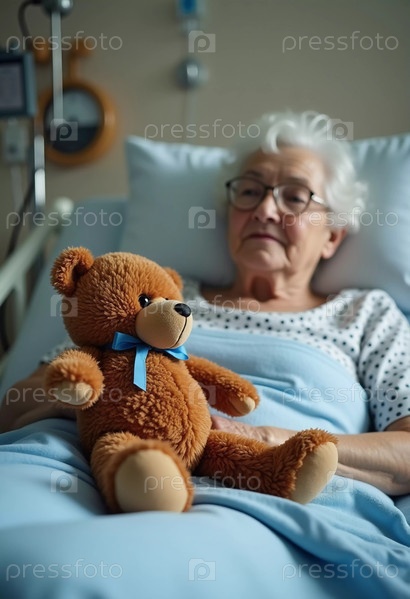 Пожилая женщина отдыхает на больничной койке, держа в руках плюшевого мишку. Успокаивающее присутствие мягкой игрушки обеспечивает ей компанию и тепло во время ее непростого пребывания