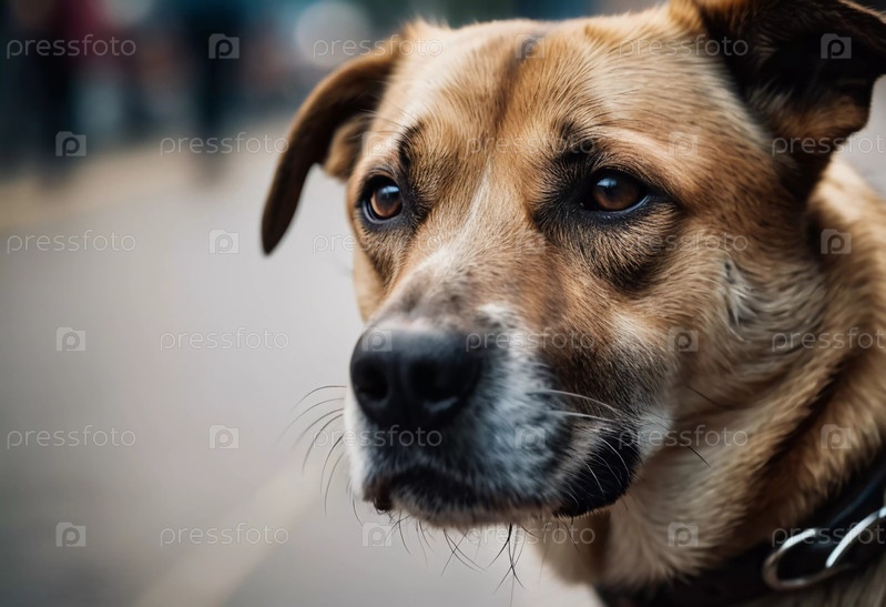 Интересная собака гуляет по оживленному городу, наполненному пешеходами.Теплый солнечный свет заливает сцену, бросая мягкие тени на тротуар AI