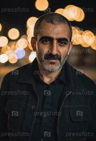 Армянский мужчина уверенно стоит на фоне мерцающих огней, демонстрируя момент харизмы и присутствия. Городская ночная жизнь добавляет магический штрих к его поведению