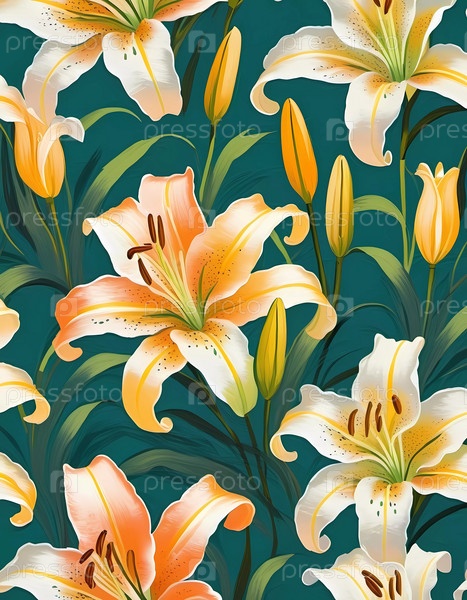 Красивая композиция из оранжевых и белых лилий цветет на насыщенном зеленом фоне. Распускающиеся цветы добавляют пышности и яркости цветочному дизайну. Генеративный ИИ