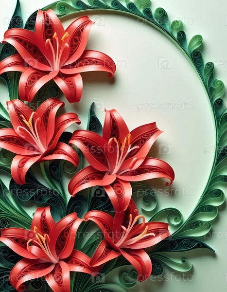 Прекрасно выполненные красные цветы демонстрируют искусную работу квиллинга, элегантно расположенные в круговом дизайне с детализированными зелеными листьями на мягком светлом фоне. Генеративный ИИ